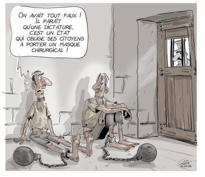 “We had it all wrong! It appears that a dictatorship is a nation that forces its citizens to wear a surgical mask!” By André-Philippe Côté