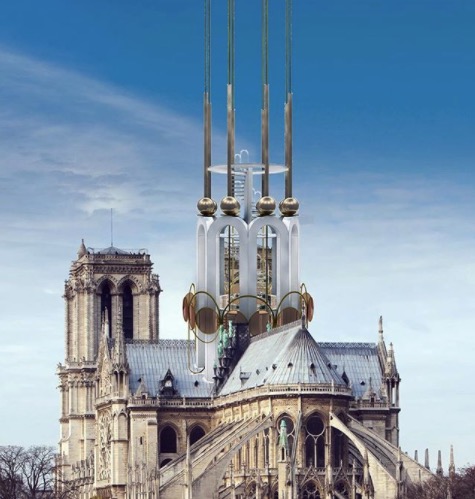 Cyprus-based architectural studio, Kiss The Architect, proposed replacing Notre Dame’s spire with an eclectic mix of arches and balls wrapped around a central staircase.